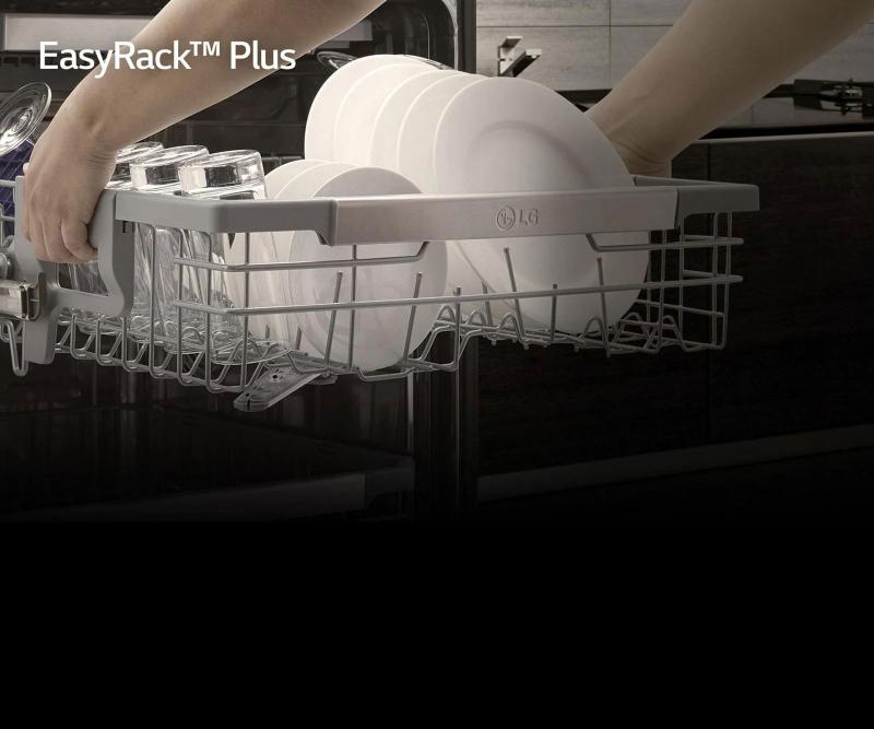 EasyRack Plus lets you fit more dishes, run fewer loads and make short work of after-dinner cleanup. With three height settings, the upper rack adjusts effortlessly and smoothly to make room for tall stemware on top or oversize pans below. Customizable tines offer greater flexibility for loading dishes of all shapes and sizes without compromising cleaning performance.