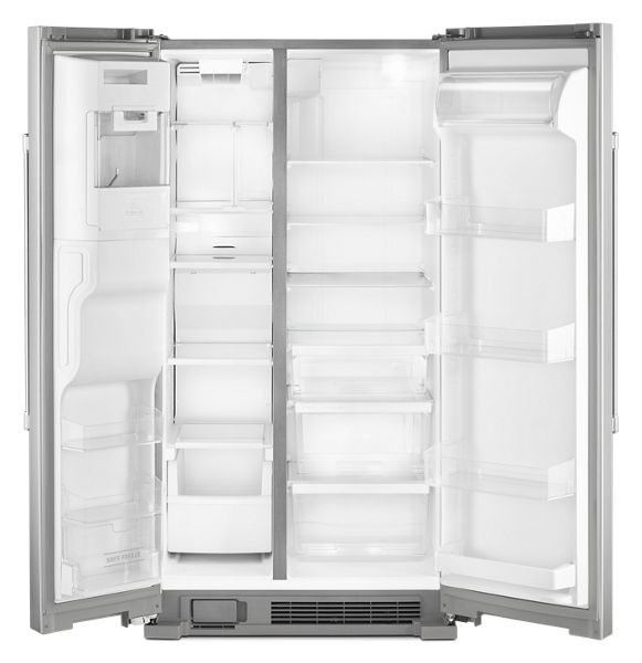 This side-by-side refrigerator is built tough and easy-to-clean with its fingerprint resistant stainless steel finish. Built with plenty of storage options, including a specially designed soft freeze bin that puts you in control of the way foods freeze. Put in a pint of ice cream and it's soft enough to scoop. Frozen pizza storage stores two frozen pizza boxes upright and out of the way, so quick meals are an easy grab. The distinct and durable Signature Maytag® metal shelf adds a bold look to the inside. With an exterior ice and water dispenser for easy access, plus a 10-year limited parts warranty1* on the compressor, this side-by-side fridge will keep it all cool for years and years.