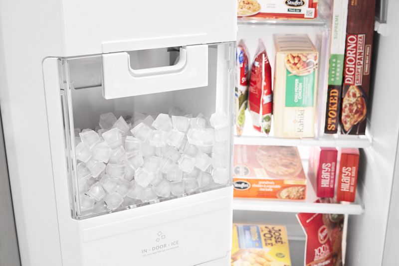 The Store-N-Door® ice dispensing system frees up shelf space in the freezer, creating more room for tall items on the shelf. Plus, the bin is removable, so it's perfect to use for filling large containers like blenders and coolers.