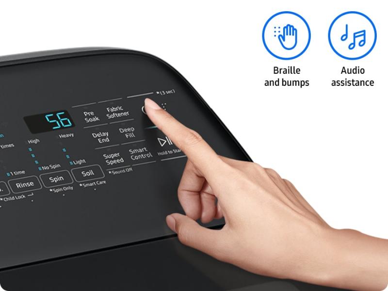 Find the right controls easily even if you are visually impaired. The top-load washer provides audio assistance by playing a different sound for each option. It also has braille next to the buttons on the control panel to indicate exactly what they are.