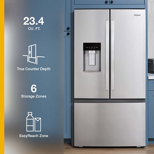 Maximize organization and minimize clutter with 6 organizational zones in this large capacity Whirlpool® True Counter Depth French Door Refrigerator. Organize and access tall items like milk, juice and soda with EasyReach Zone. See & store oversized produce with stacked EasyView Drawers, and shift between temperature settings and store wine, deli items, meat and more with Flexible Temperature Drawer.