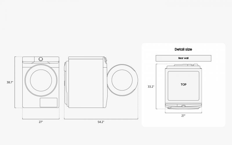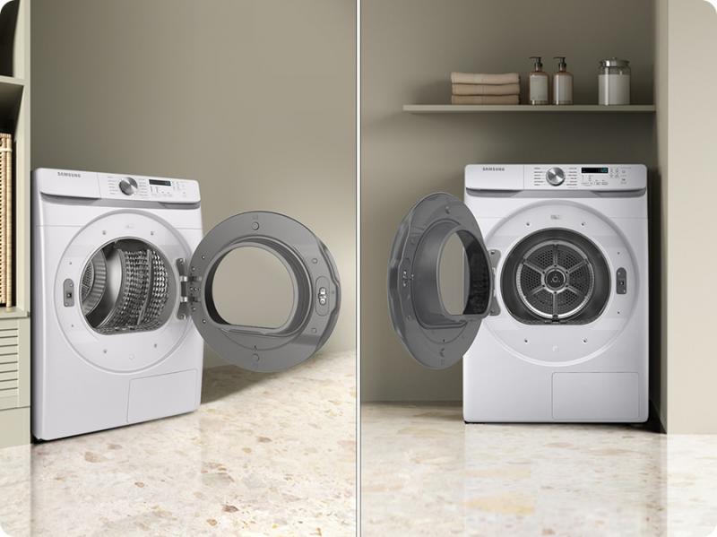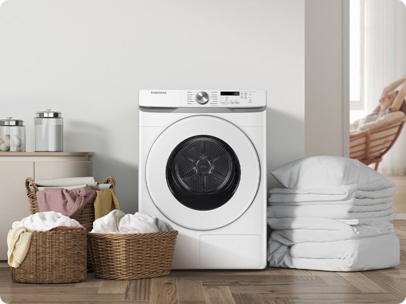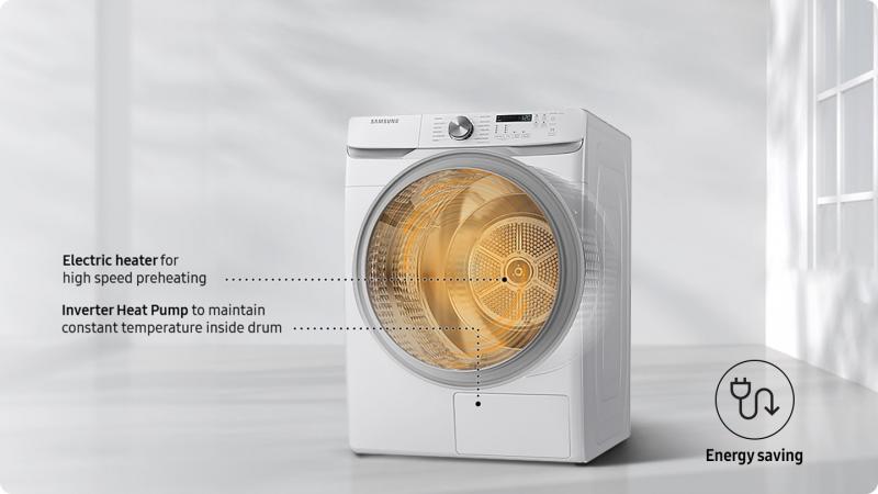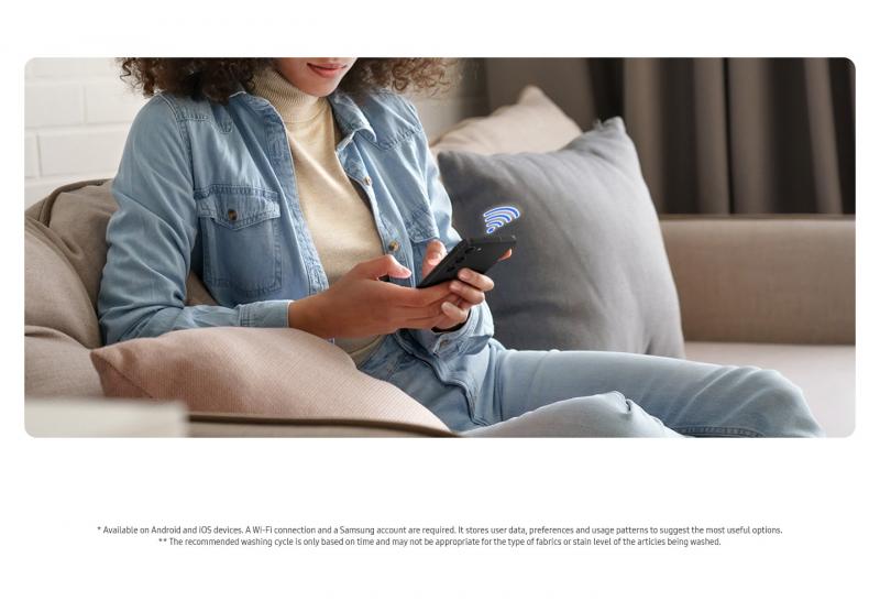 * Based on using a Normal cycle with an 8.45lb DOE (cotton 50% + polyester 50%) load with a Residual Moisture Content (RMC) of 57.5% after a wash cycle. Individual results may vary based on actual load contents. ** Available on Android and iOS devices. A Wi-Fi connection and a Samsung account are required. It stores user data, preferences and usage patterns to suggest the most useful options.