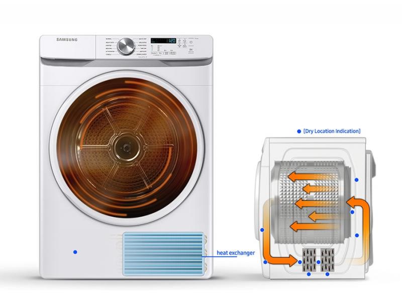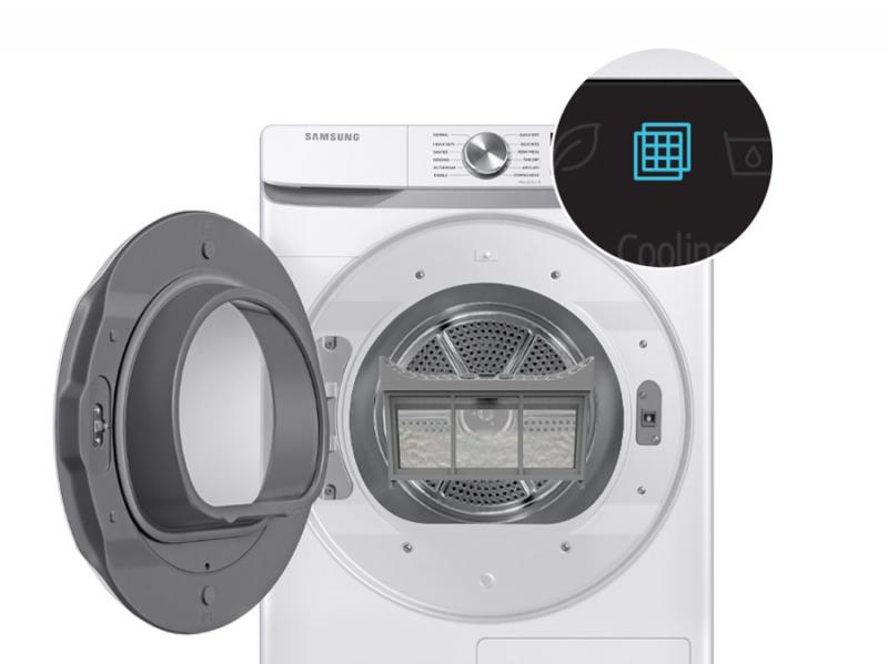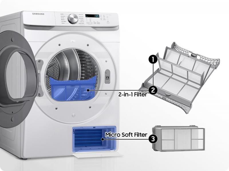 The 3 layered filter system helps capture the dust and fibers that come off drying clothes. It does so by first using a 2-in-1 filter under the drum followed by a third micro soft filter in front of the Heat Exchanger.