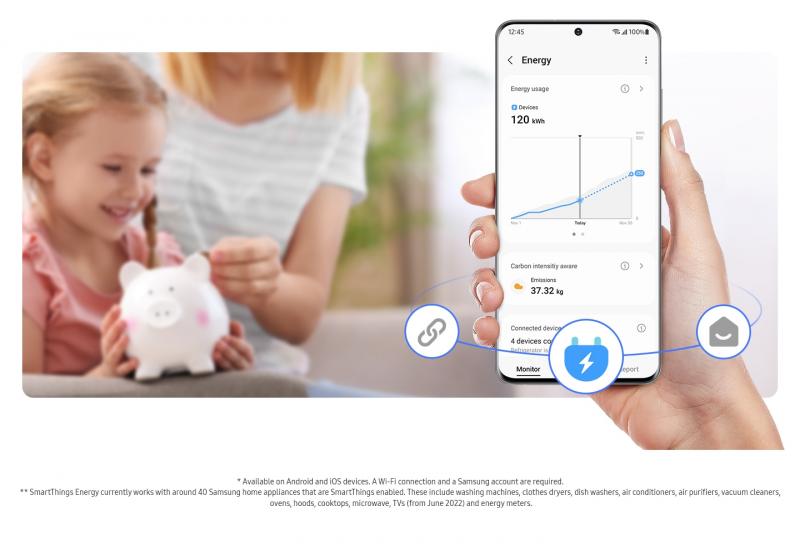 SmartThings Energy* provides energy usage updates. It monitors the energy consumption of appliances** in real-time and compares it to the previous month. It alerts you if your monthly targets are exceeded.