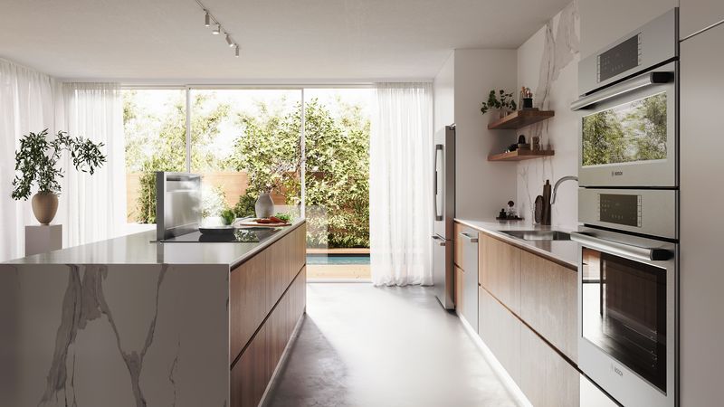 Sleek, built-in, and retracts out of sight. Bosch Downdraft’s flexible design seamlessly integrates into your kitchen.