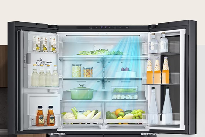 LG took its Smart Cooling system one step further by adding Door Cooling®+ to provide a steady supply of cold air to help keep door contents at peak freshness. Images may be simulated and dramatized for illustrative purposes. Actual features, functionality, and other product specifications may differ and are subject to change without notice.