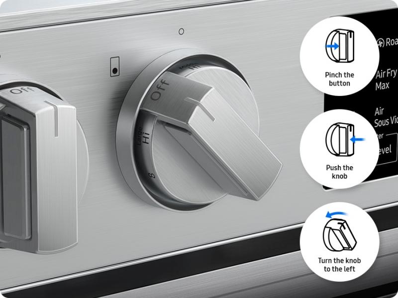 Precisely control and ensure proper activation of your cooktop. The Precision Knob buttons must be pinched in before the knobs can be pushed and turned, so that you can be sure you only turn on the range when you want it on and help avoid unintentional push-and-turns.