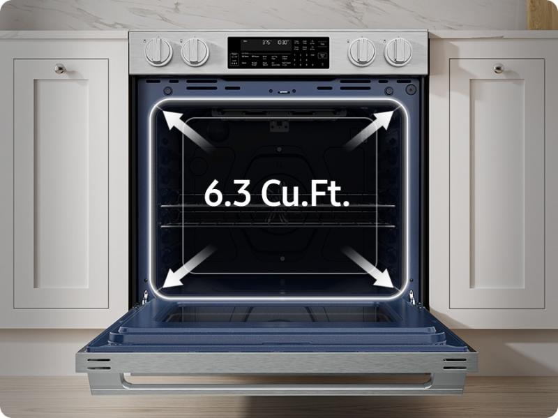Accommodates large cookware and family-sized meals with a huge 6.3 cu. ft. capacity oven, making it perfect for everyday dinners or entertaining guests. Prepare multiple dishes at once or easily cook large items like a big roast or holiday turkey.