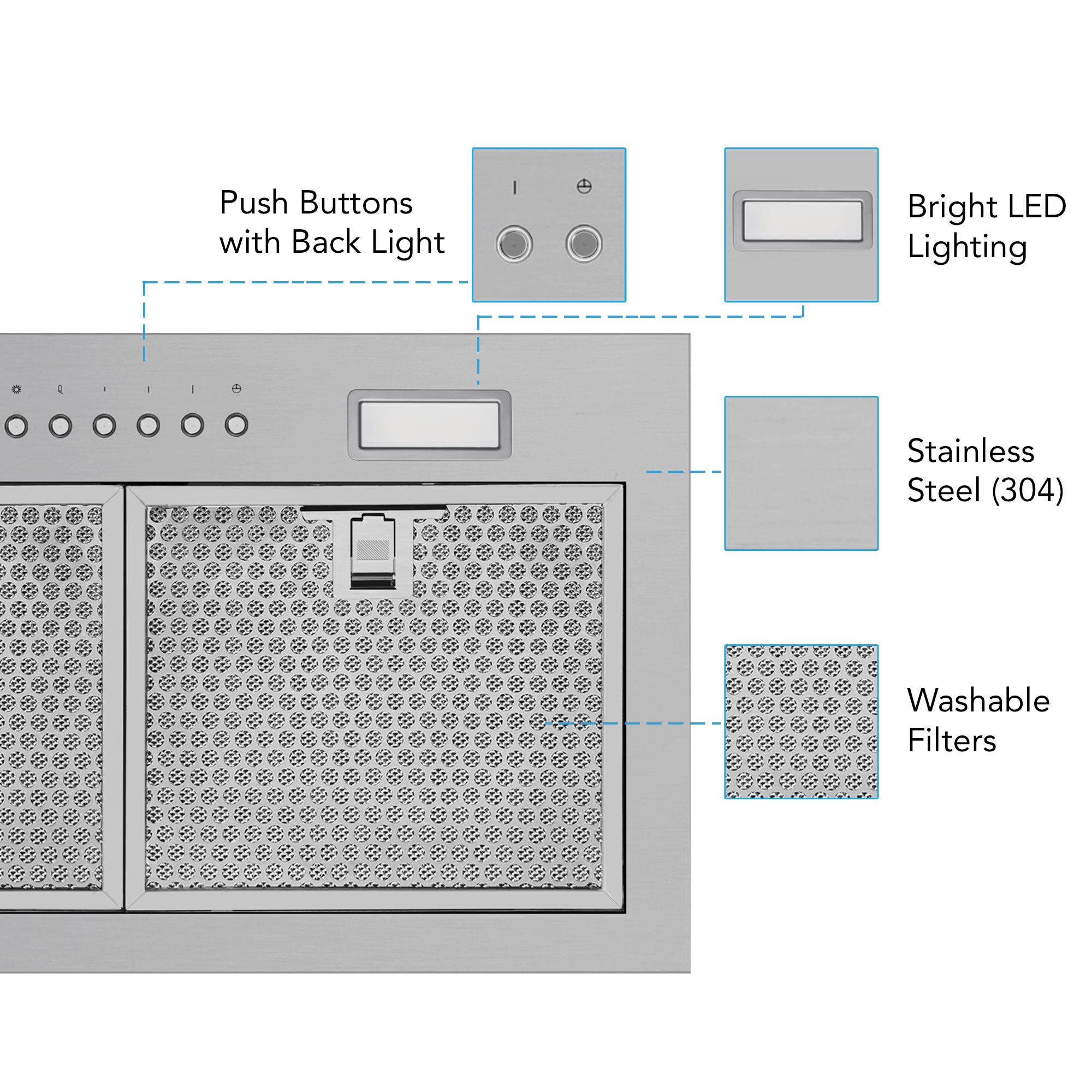 - Push-button controls allows simple control over the fan speeds and lights with a built in auto-shutoff timer, allowing you to leave the range hood on after cooking to capture any lingering smoke and odors.
