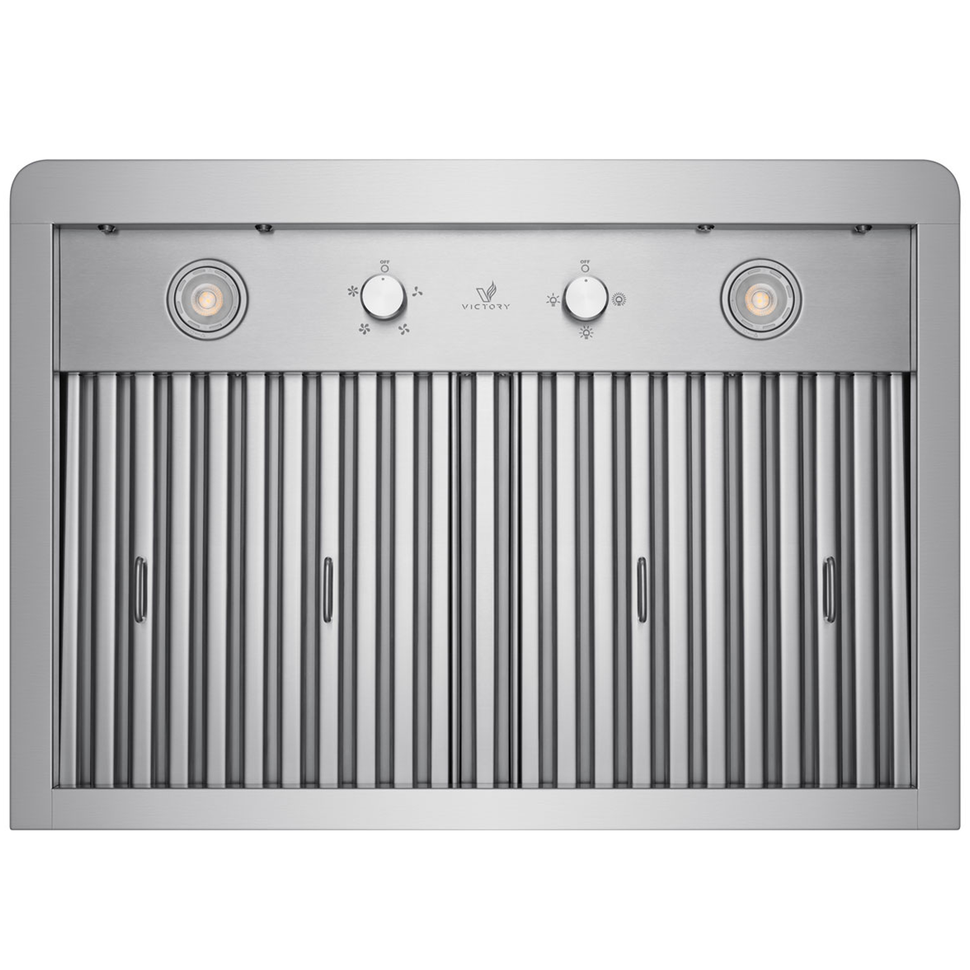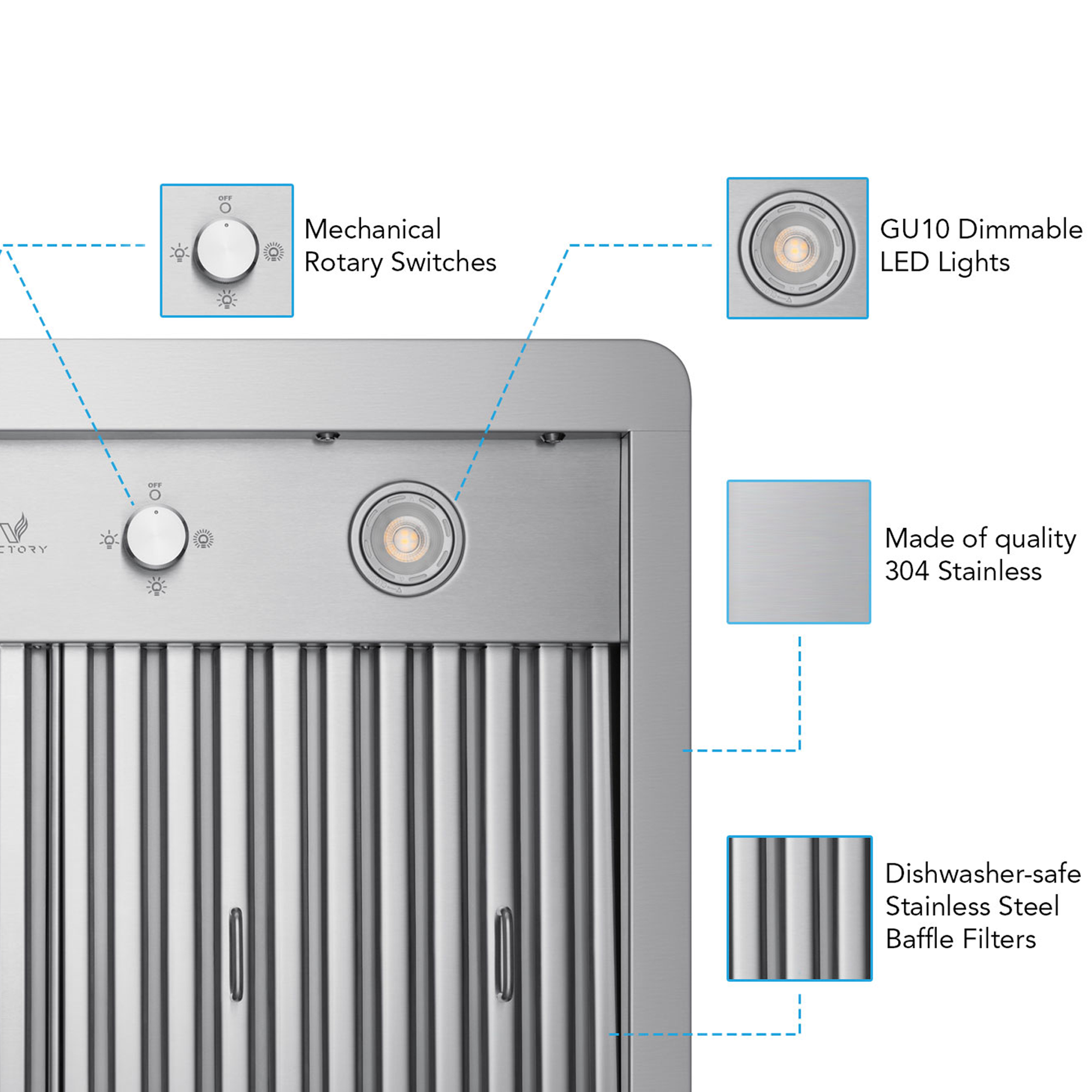 Bring a professional quality and performance to your kitchen with the Victory Elegant. Made with high quality mechanical switches, an all metal 600 CFM blower and stainless steel baffle filters making it efficient, easy to use and easy to clean. Comes with a standard 6-inch round duct and adjustable chimney covers for 8-9' ceilings, making it compatible with most kitchens. The bright warm dimmable LED lights provide great visibility and the filters are dishwasher safe and reusable, giving you long lasting problem free service.