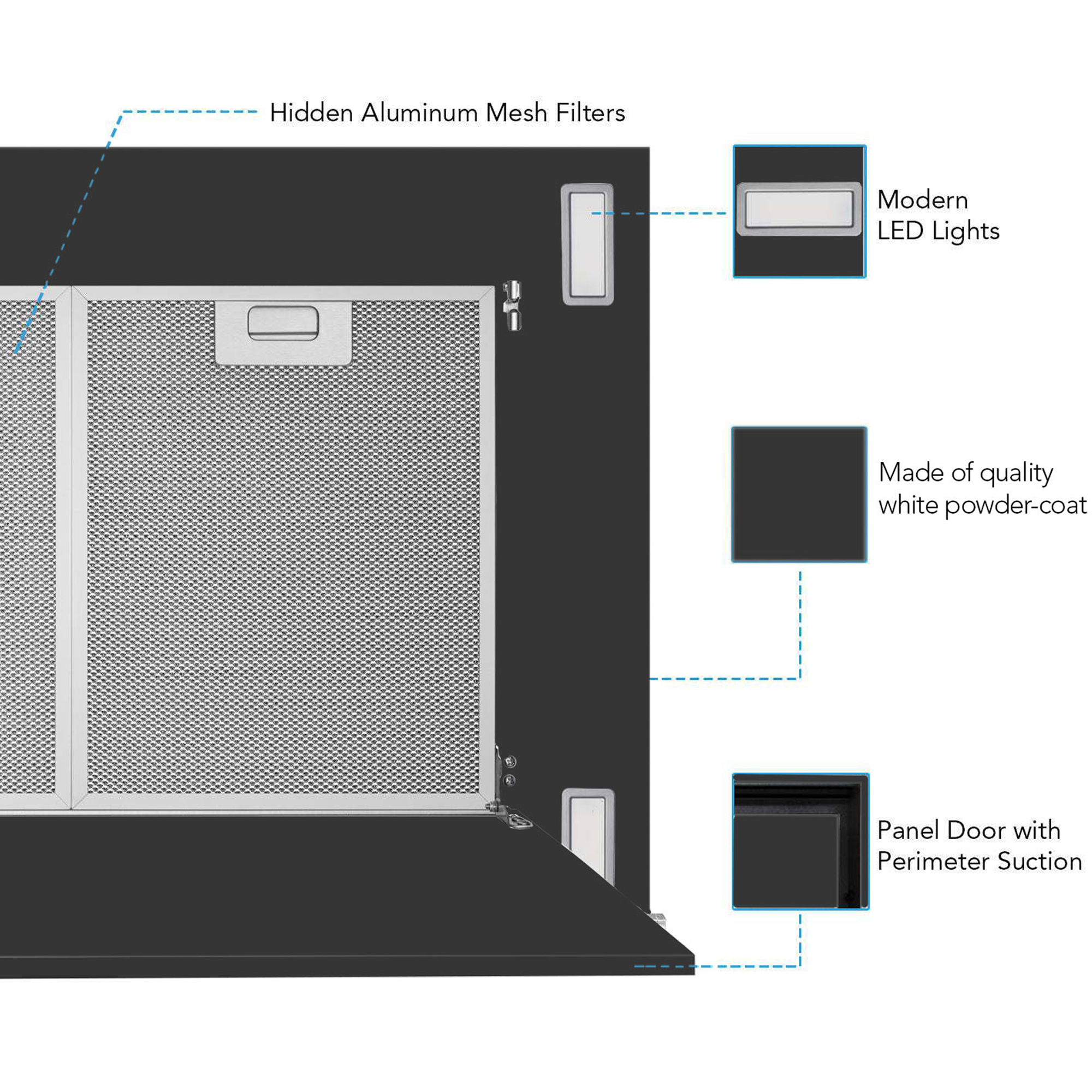 - Bottom door panel creates a perimeter suction, increasing its airflow and suction power around the center of the range hood
