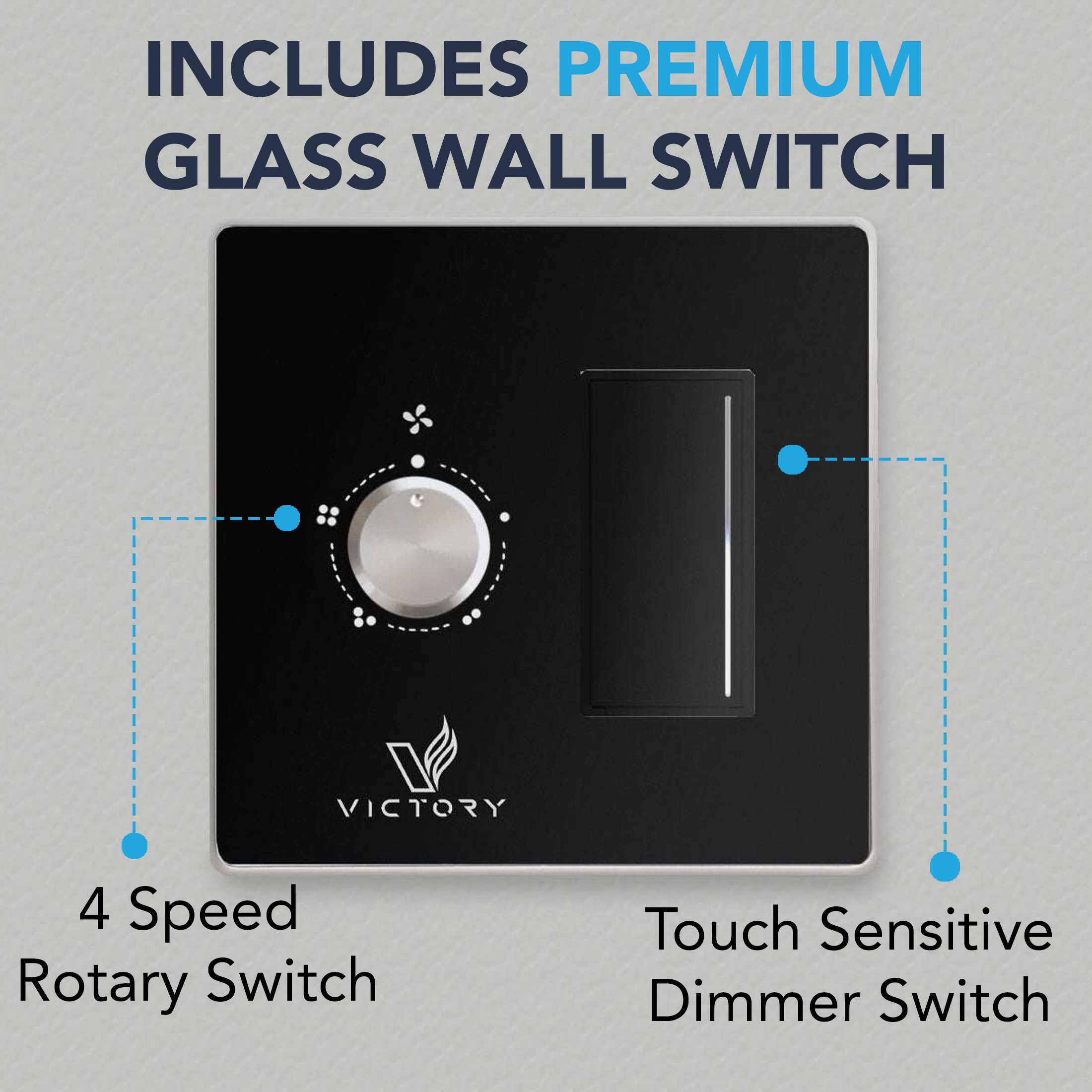 - Motor and dimmable LED's are controlled with included wall switch with premium glass wall plate